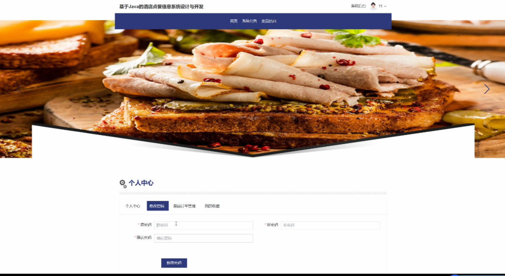 个人中心:个人中心提供了个性化服务,如修改密码,确保用户账户安全;菜品订单管理,让用户能够追踪自己的点餐历史,方便复购或评价;我的收藏则允许用户收藏喜爱的菜品,便于日后快速查找和点餐。