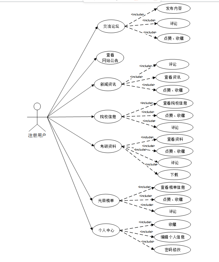 用户在成功登录后,系统会根据用户的权限展示相应的功能。用户便可以浏览交流论坛、网站公告、新闻资讯、院校信息、考研资料、光荣榜单、个人中心(首页、收藏、评论管理)等。用户用例图如图3.1所示。