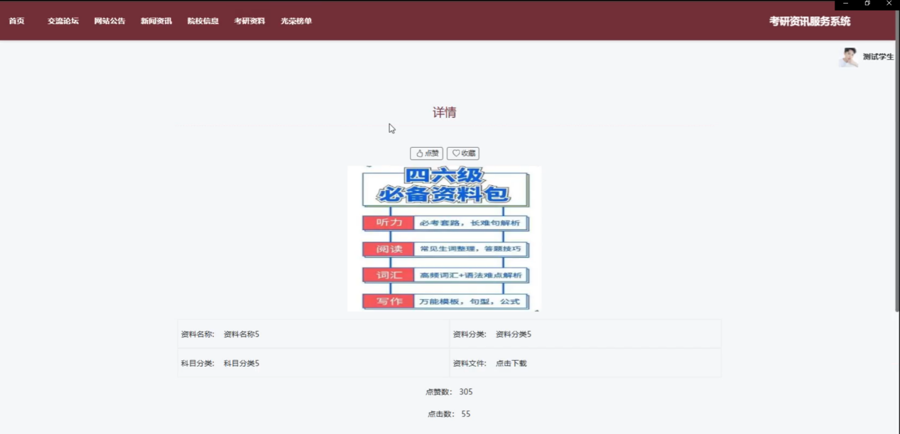 新闻资讯:用户可以浏览与考研相关的新闻资讯,支持点赞、评论、收藏功能。