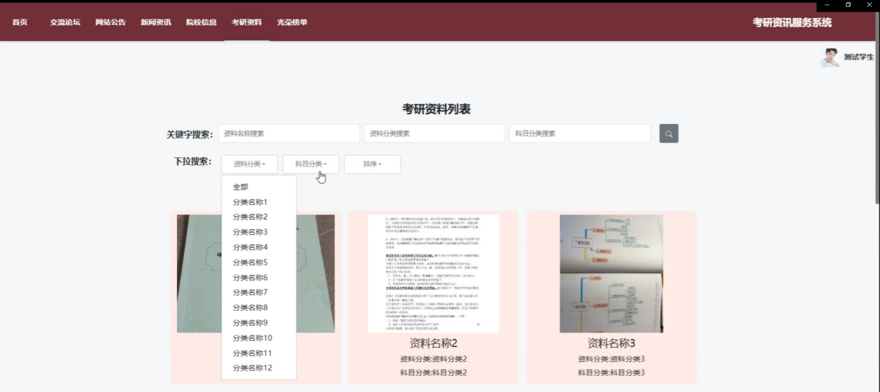资料分类管理:管理员负责对考研资料进行分类管理,包括新增、修改和删除不同的分类。