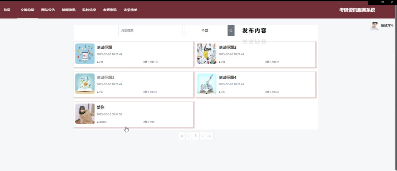 This system is designed and implemented based on WEB and Spring Boot framework, providing a comprehensive and convenient information query and communication platform to serve the vast number of postgraduate students. The system is divided into two main roles: registered users and administrators. Registered users can access homepage information, participate in communication forums, view announcements and news, learn about university information, access postgraduate entrance examination materials, view prestigious rankings, and manage their personal center's collection and comment content through the platform. Administrators have extensive management privileges, including managing system users, college information, postgraduate entrance examination materials, classification management, honor lists, announcements, and news information. They are responsible for forum management, slideshow, sensitive word filtering, and resource updates. Through modular design, the system ensures real-time information updates and convenient and efficient user operations, providing a comprehensive information, resource, and communication platform for postgraduate students and educators.