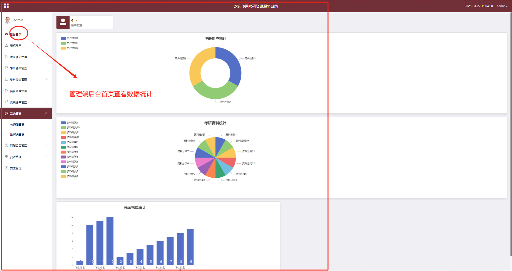 为了提升信息展示的直观性,系统引入了可视化图展示功能。用户可以通过图表查看各种考研相关数据,如考试科目分布、院校录取情况、考研资料使用情况等,帮助考生更好地分析备考中的各种信息,做出更有效的决策。