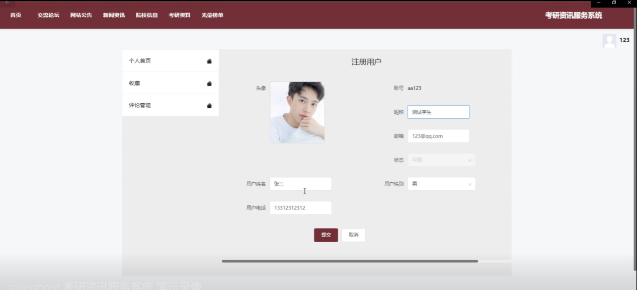 本系统基于WEB和Spring Boot框架设计与实现,提供了全面、便捷的信息查询与交流平台,服务广大考研学子。系统分为两大主要角色:注册用户和管理员。注册用户可以通过平台获取首页信息、参与交流论坛、查看公告和新闻资讯、了解院校信息、查阅考研资料、查看光荣榜单,并管理个人中心中的收藏和评论内容。管理员拥有广泛的管理权限,包括管理系统用户、院校信息、考研资料、分类管理、光荣榜单、公告和新闻资讯等,负责论坛管理、轮播图、敏感词过滤和资源更新。通过功能模块化设计,系统确保信息实时更新和用户操作便捷高效,为考研学子与教育工作者提供了一个综合性的信息、资源和交流平台。