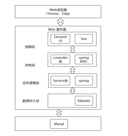 系统使用Spring Boot与Vue框架进行搭建,架构分为视图层、控制层、业务逻辑层、数据持久层和数据库服务器。视图层利用Vue框架和Element UI界面渲染工具构建前端页面,前端页面通过HTTP协议发送请求至控制层。控制层与业务逻辑层通过Spring Boot框架搭建,控制层接收前端请求,进行解析和数据校验,将数据传递至Service层进行业务逻辑处理。业务处理完成后,通过数据持久层访问数据库服务器,执行数据库操作,最终将结果返回至控制层,并传递至前端进行页面处理。本系统开发的技术架构图如图4.1所示。