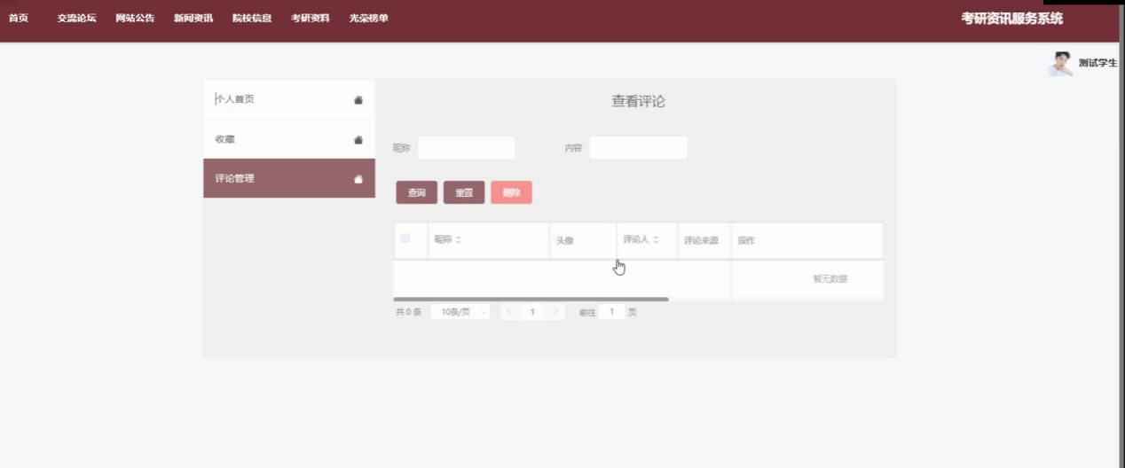 管理员可以对考研资料进行增、删、改、查操作,上传新的考研资料供用户下载。同时,管理员可以查看用户对资料的评论和反馈,并对不适宜的资料进行审查和删除。如图 5.13。