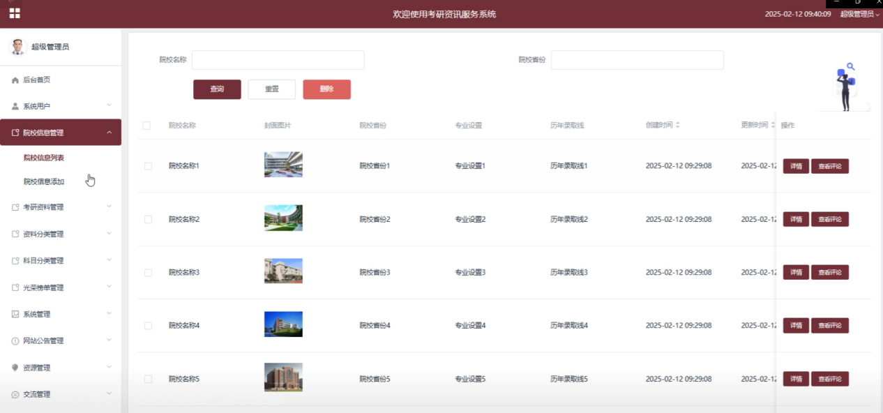 院校信息管理:管理员可以对平台上的院校信息进行增、删、改、查操作。并能够查看用户对院校信息的评论,及时进行反馈和处理。