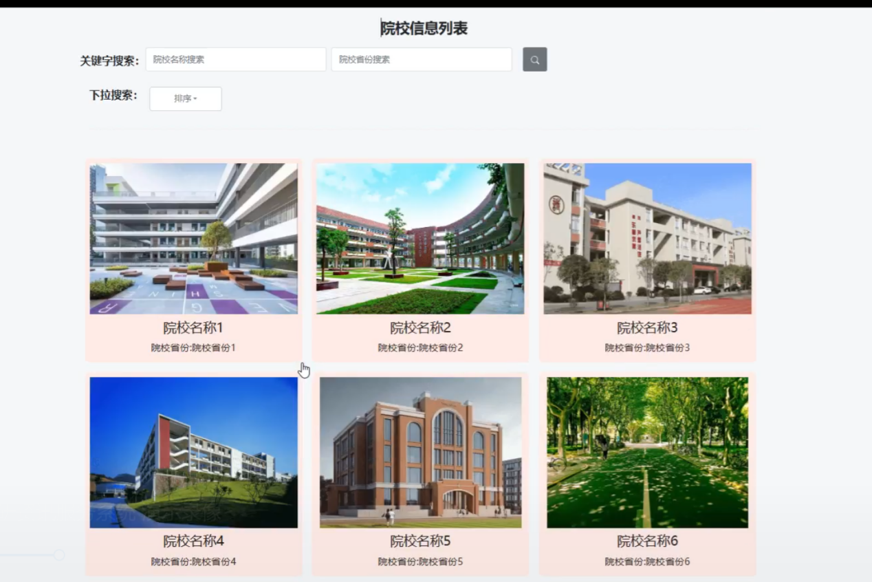 用户可以通过院校名称、所在省份等关键词搜索院校信息如图 5.6,支持对院校信息进行点赞、收藏及评论如图 5.7。