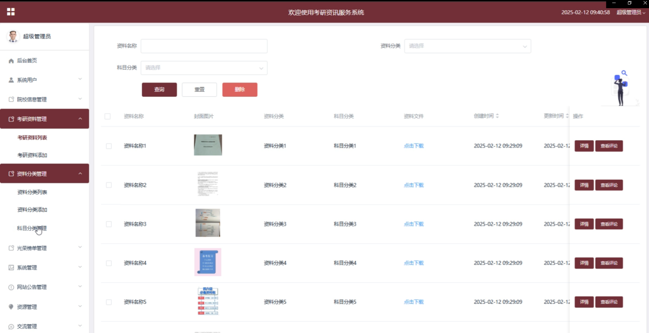 考研资料管理:管理员可以对考研资料进行增、删、改、查操作,上传新的考研资料供用户下载。同时,管理员可以查看用户对资料的评论和反馈,并对不适宜的资料进行审查和删除。