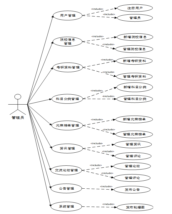 管理员在完成登录后,需要管理用户信息,院校信息管理、考研资料管理、资料分类管理、科目分类管理、光荣榜单管理、系统管理(轮播图)、网站公告管理、资源管理(新闻资讯、资讯分类)交流管理(交流论坛、论坛分类)进行处理。管理员用例图如图3.2所示。