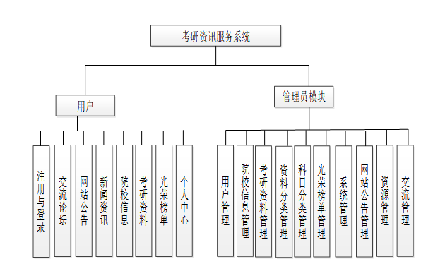 本课题主要设计并开发一个基于WEB的考研资讯服务系统,采用Spring Boot框架实现,为考生提供全面的考研信息、院校资料、考试资讯及学习资源,帮助考生高效获取相关内容并辅助备考。如图 4.2所示为基于考研资讯服务系统的系统功能结构图如图 4.2所示。