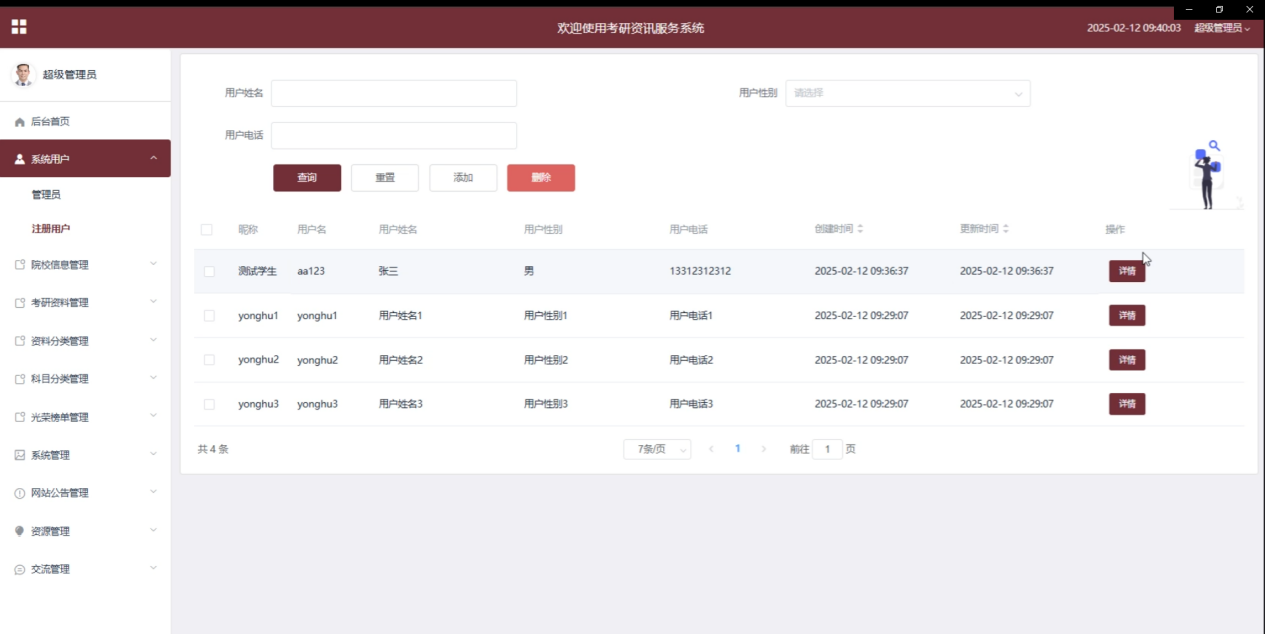 系统用户管理:管理员能够对平台上的所有用户进行管理,包括注册用户和管理员的权限管理。管理员可以新增、查询、修改和删除用户信息。