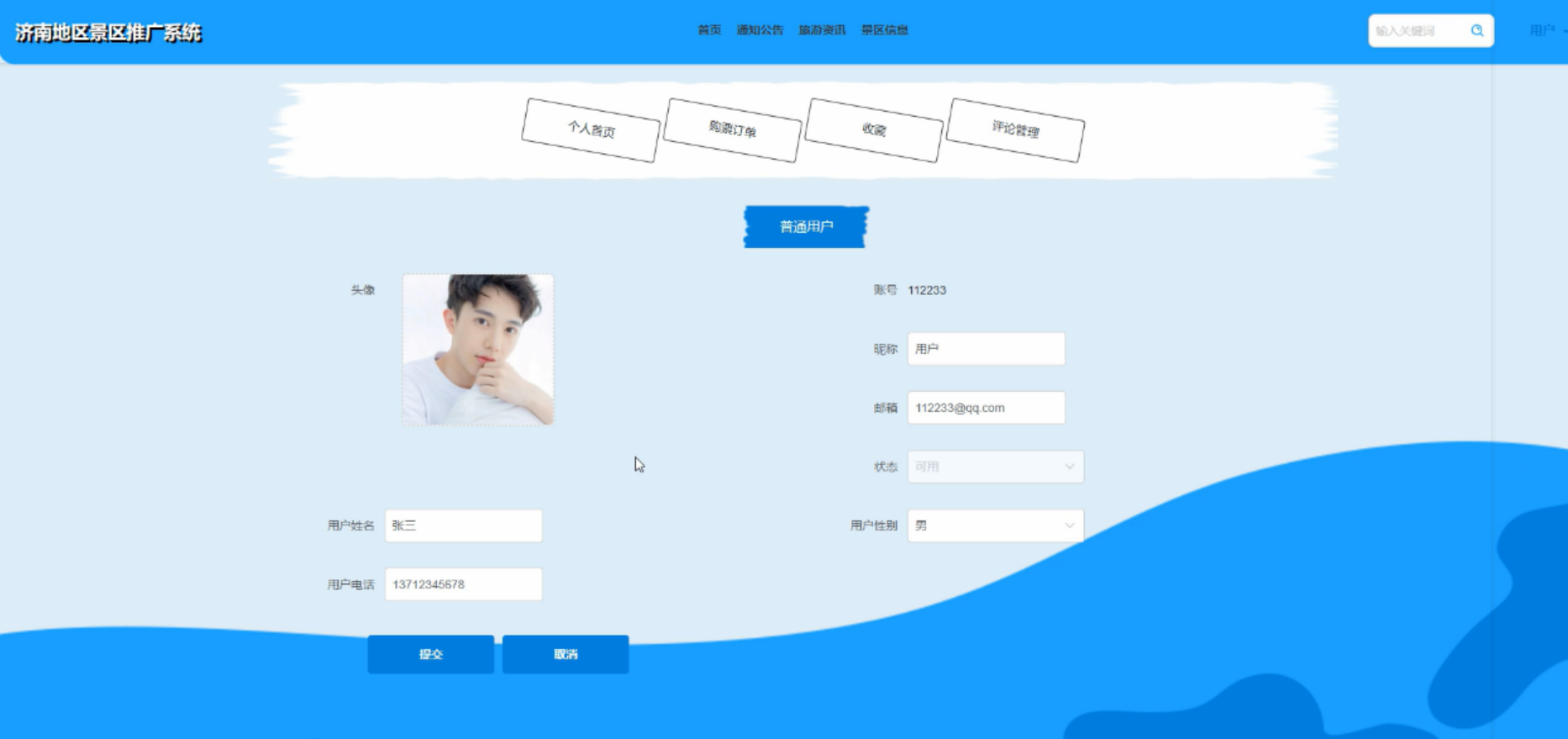 个人中心:个人中心包含了个人首页、购票订单、收藏和评论管理等功能。个人首页展示了用户的个人信息和旅行记录;购票订单功能允许用户查看和管理自己的购票记录;收藏功能方便用户保存感兴趣的景区和资讯;评论管理功能则让用户能够发表和查看自己对景区和资讯的评论。