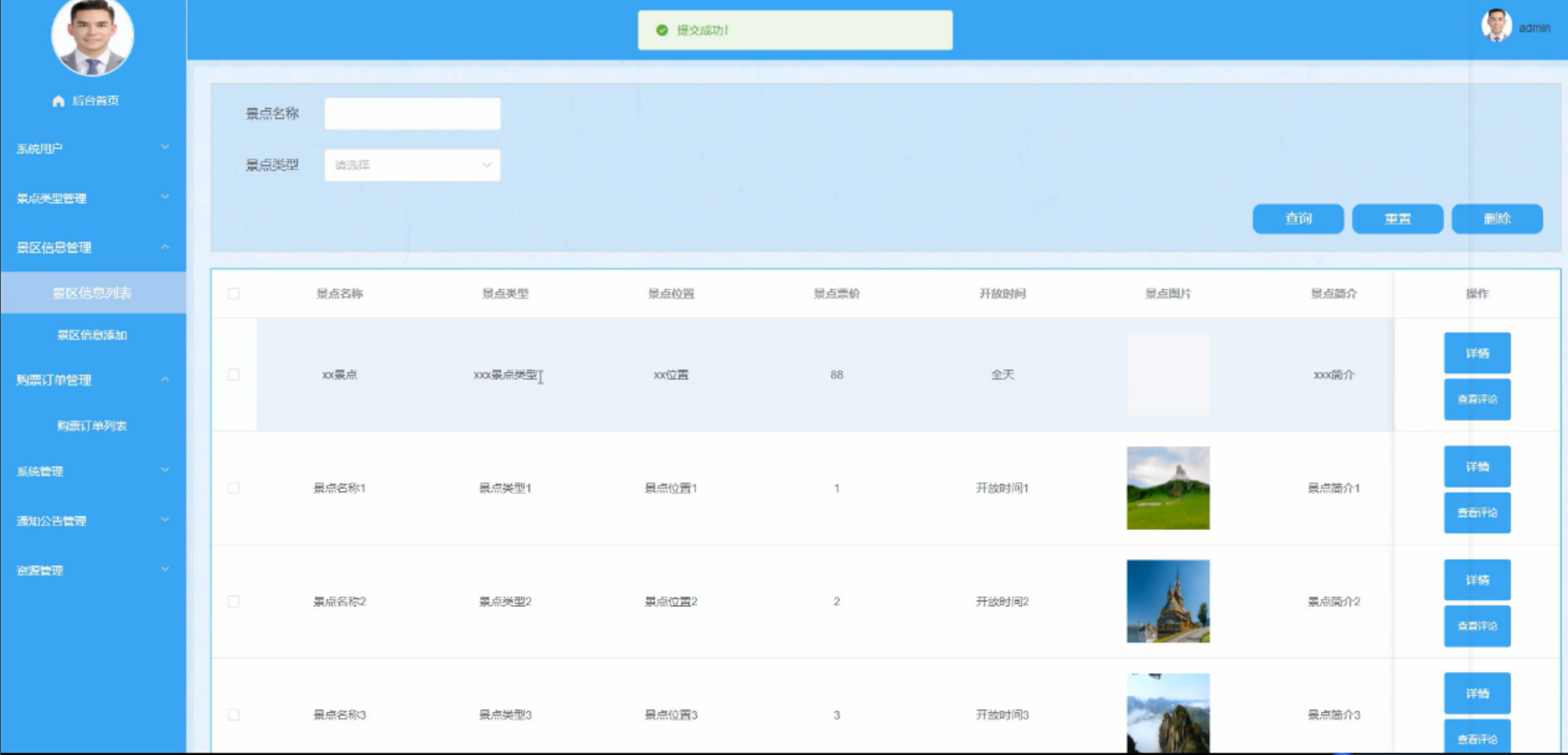 景区信息管理:管理员可以添加、删除、修改景区信息,包括景区名称、图片、介绍、门票价格等,确保景区信息的准确性和完整性。