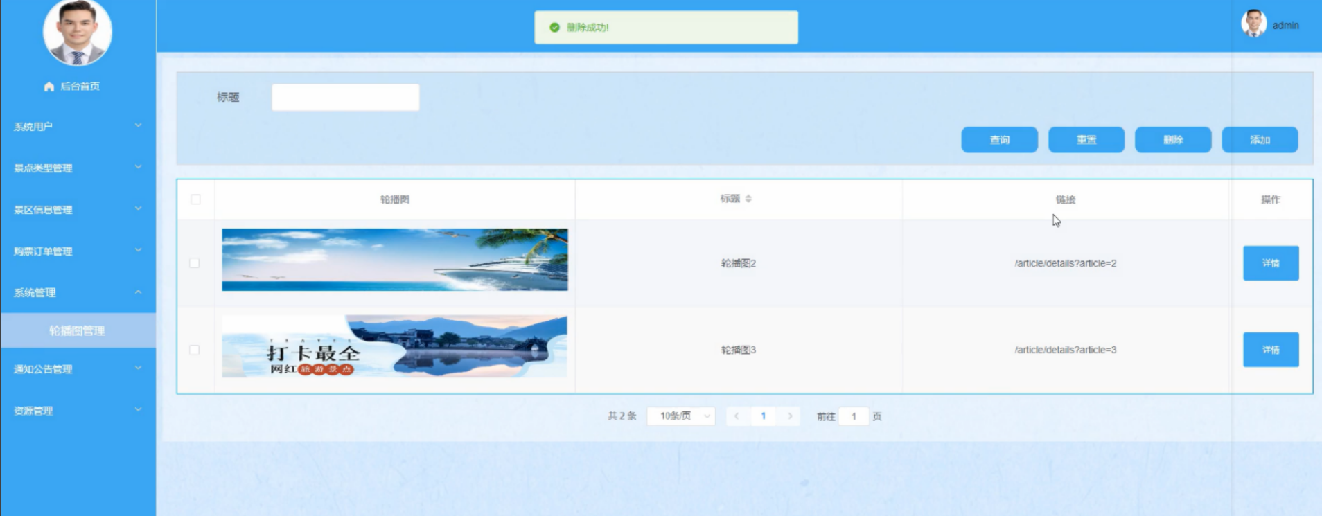 系统管理:包括轮播图管理功能,管理员可以上传、删除、修改轮播图,以展示最新的旅游亮点和活动信息,提升用户体验。