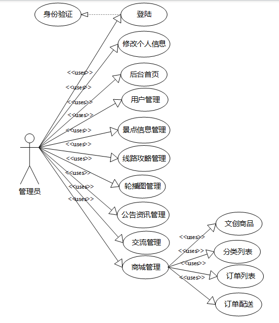管理员通过后台管理用户信息、景点数据、旅游线路、攻略、公告、资讯等内容,确保平台信息的及时更新与准确性。管理员可添加、编辑或删除景点和线路信息,发布旅游资讯和攻略,管理商城商品及订单,处理用户反馈和评论。同时,管理员负责更新首页轮播图和公告,维护平台的互动交流与秩序,优化用户体验并保证网站的顺畅运营。此角色确保了平台内容的高效管理和良好的用户体验。详细用例图如图3.2所示。