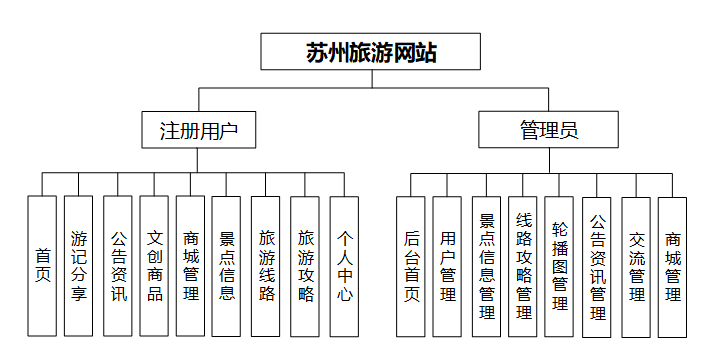 系统主要由注册用户和管理员两个角色构成。注册用户可以通过网页端和小程序端访问平台,浏览苏州的景点信息、旅游线路、攻略、公告信息及旅游资讯,参与游记分享,购买文创商品,并在个人中心管理订单、配送信息等。管理员则可通过后台管理系统对用户、景点、旅游线路、文创商品、订单等进行全面管理,确保平台的高效运营。