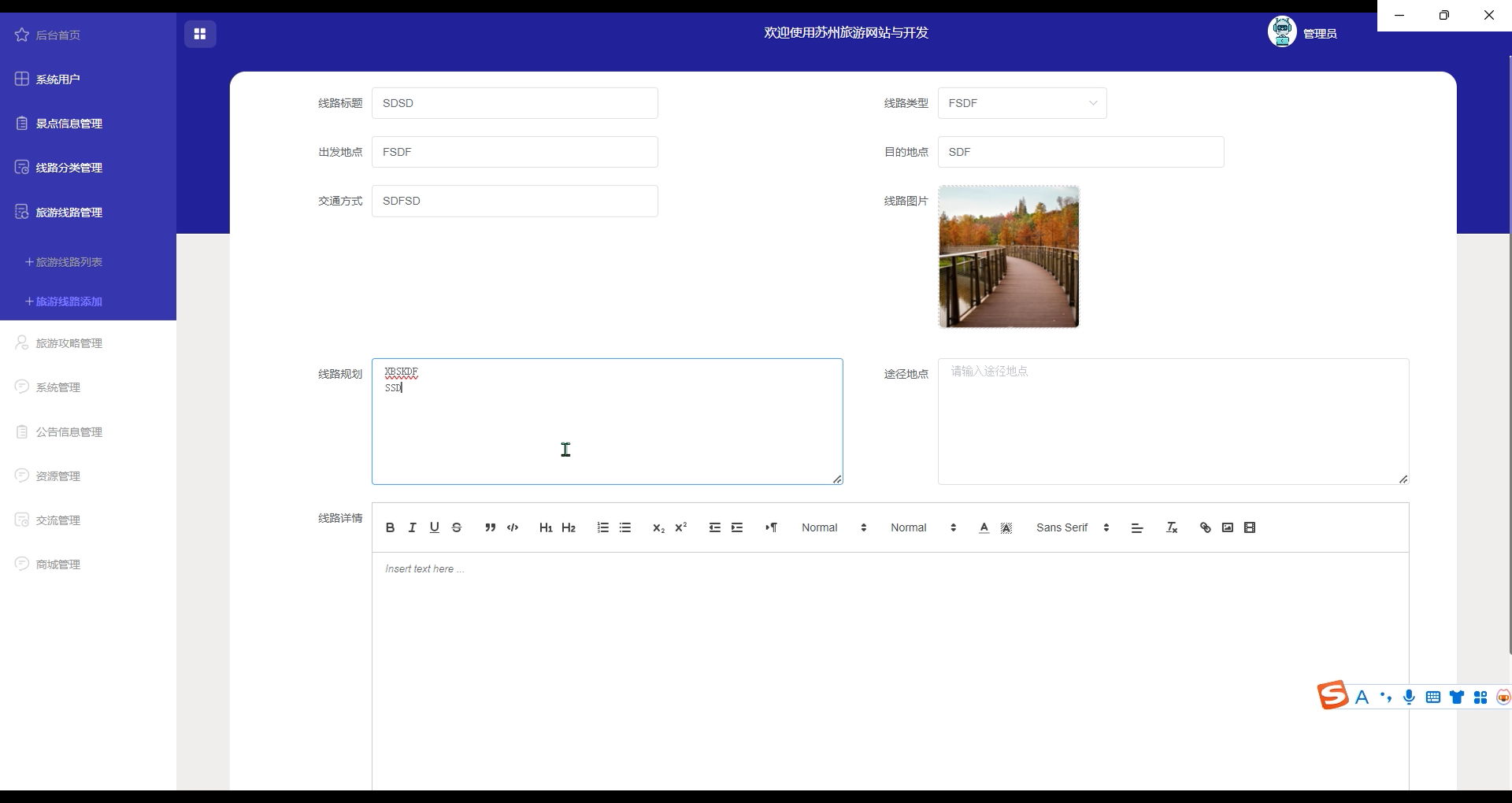 管理员创建、编辑和删除旅游线路,设置具体的行程安排、景点、价格等信息。管理员可以根据不同游客需求,设计深度游、一日游等多种线路,确保内容的丰富性和准确性。该功能帮助平台优化旅游产品,提升用户体验,同时确保所有线路信息及时更新,便于游客快速浏览和选择,促进订单转化。通过该功能,管理员能够灵活管理和调整旅游线路,满足不同市场需求。如下图所示。