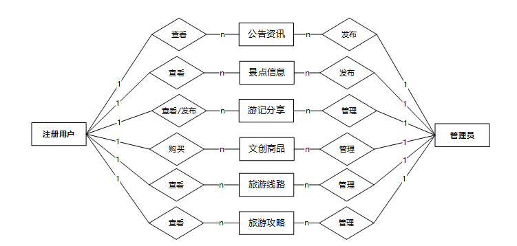 3、功能设计:系统分为注册用户和管理员两大角色。注册用户可以浏览景点信息、查询旅游线路、购买文创商品、分享游记并管理个人订单等;管理员则可以通过后台进行用户管理、景点信息更新、订单管理、商城商品管理等操作,确保系统的高效运作。