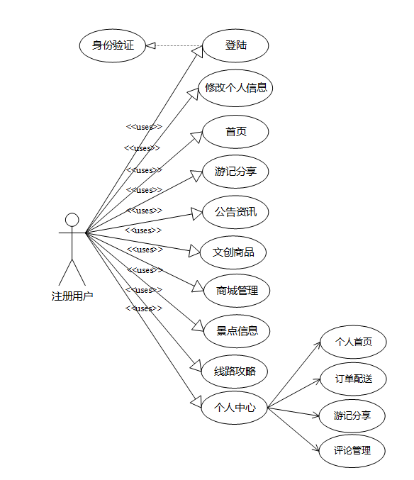 用户通过平台注册账户,登录后浏览首页、景点信息、旅游线路、攻略、资讯等内容,参与游记分享、评论互动。用户可将感兴趣的商品加入购物车、完成购买并管理订单,更新配送地址等。此外,用户可根据个人需求在个人中心查看和编辑个人信息、管理游记分享、订单配送、评论管理等操作。整个流程旨在提升用户的互动性、便捷性和个性化体验,满足其旅游和购物需求。详细用例图如图3.1所示。