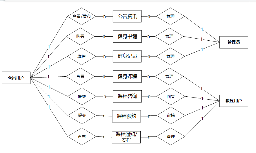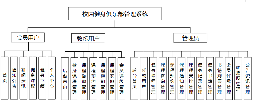 The system is divided into three major user roles: member, coach, and administrator. Members can view course information, book appointments, purchase books, and manage personal information through the platform; Coaches can manage their own courses, answer course inquiries, arrange courses, and handle member appointments; Administrators are responsible for global management, including the management and statistics of resources such as courses, appointments, membership, books, notifications, etc. The system also has data statistics function to help administrators timely understand the usage of fitness resources and member feedback.