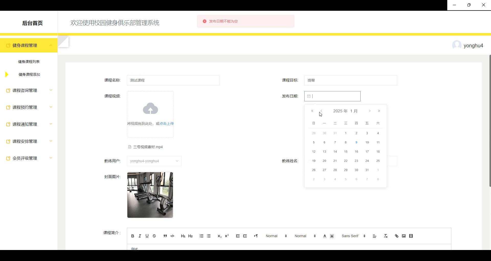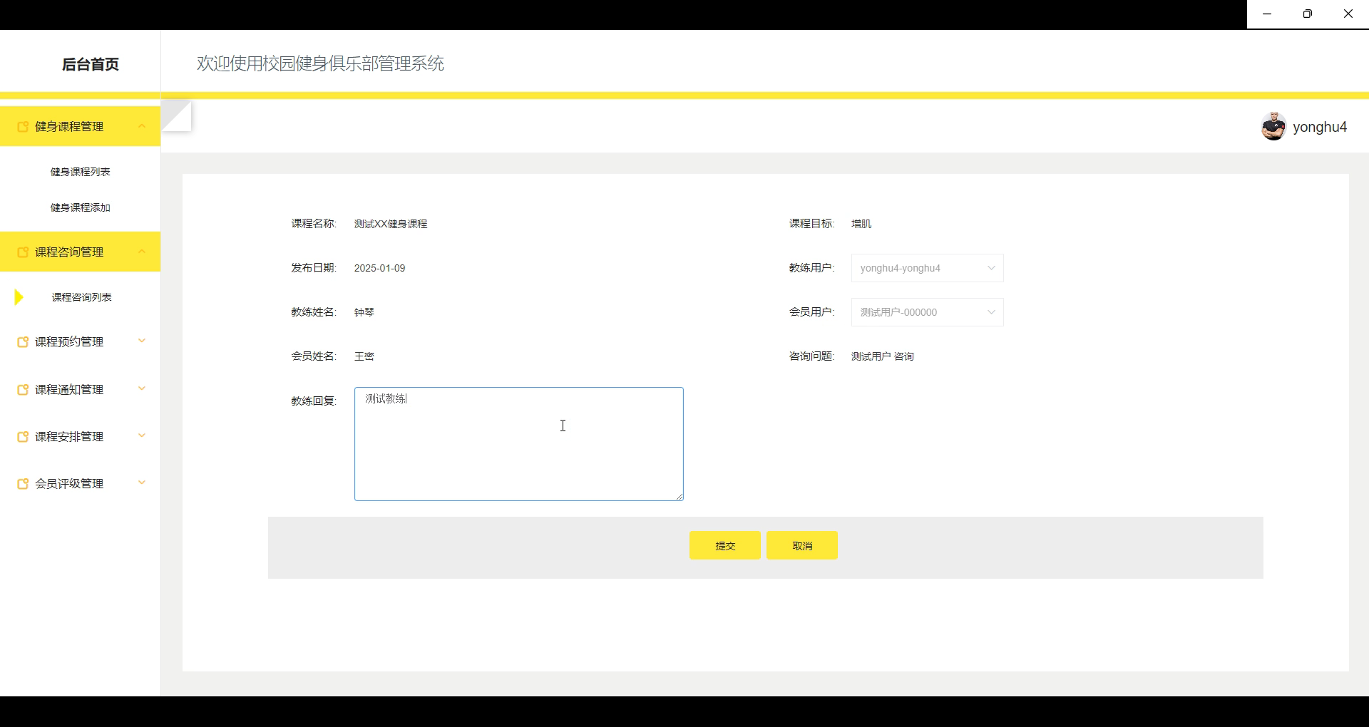 健身课程管理:管理员管理俱乐部所有的健身课程信息,涉及课程的添加、修改、删除、分类等。管理员还可以定期检查课程内容的合理性和用户的反馈,对课程进行优化。