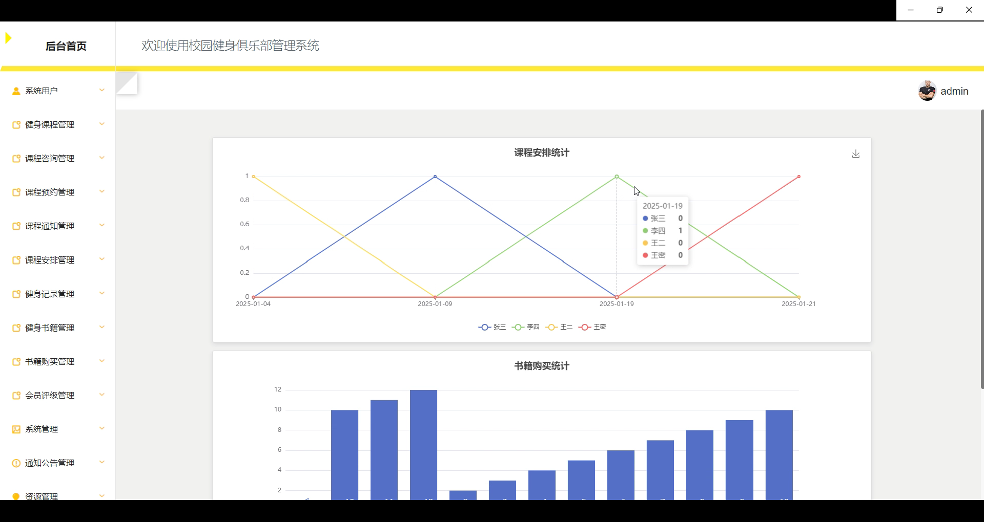 后台首页:管理员登录后,首页展示俱乐部运营的关键统计数据,如课程安排的统计情况、书籍购买的情况、会员评级分布等,便于管理员实时掌握俱乐部的运营状态。