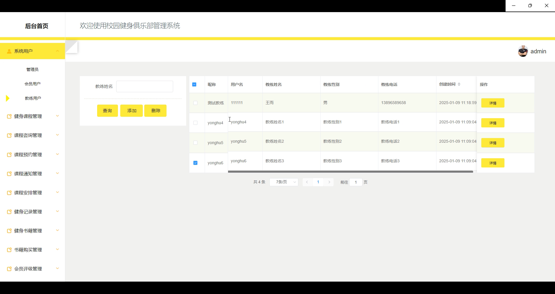 用户管理:管理员负责对俱乐部内的用户进行管理,包括管理员、会员用户和教练用户的账户管理、权限设置以及信息更新。可以查看和修改用户的基本信息,设置或更改用户权限。