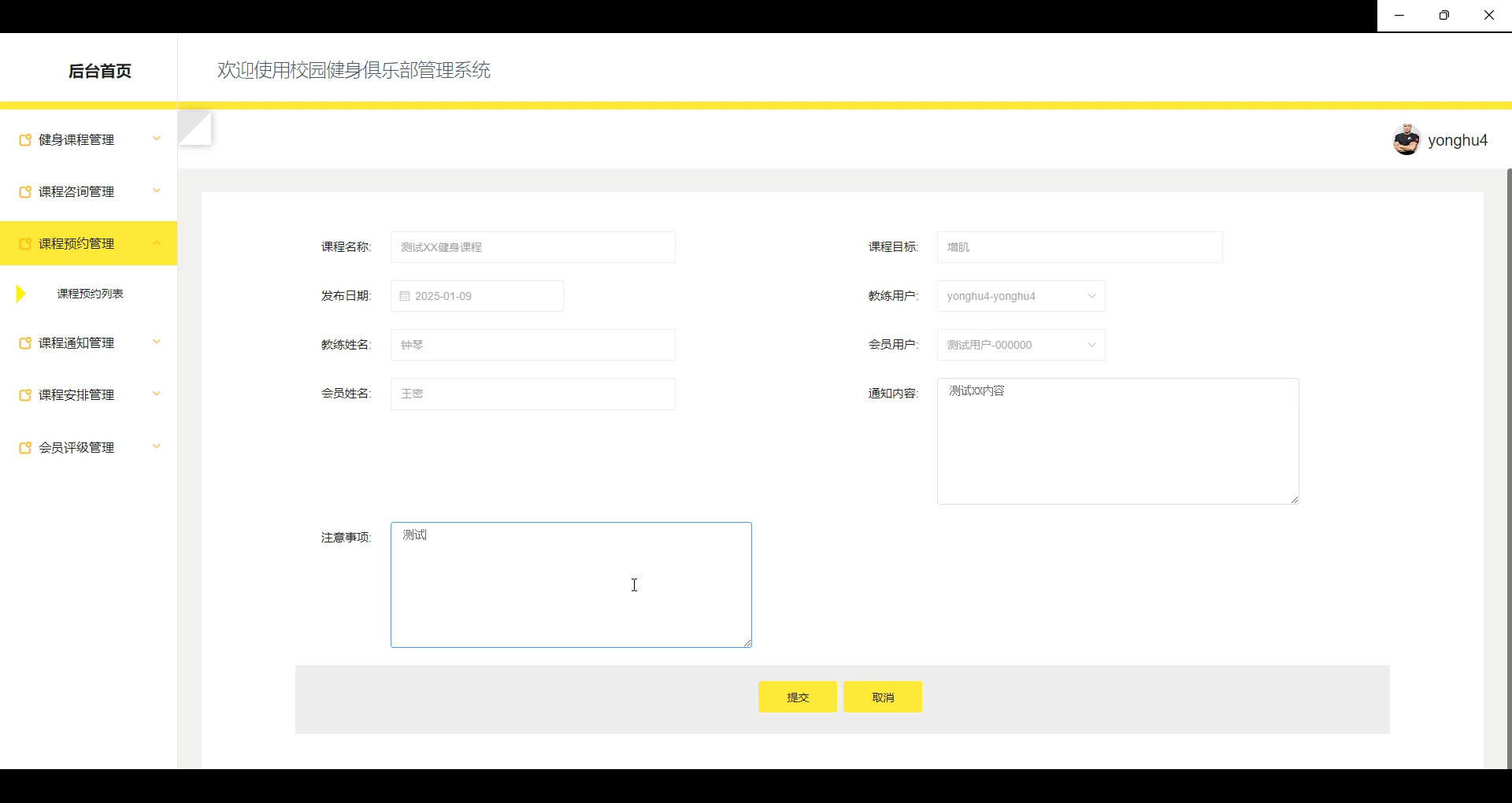 课程预约管理:管理员对会员的课程预约进行全面管理,审核预约信息,检查课程预约的合理性,确保课程资源的有效利用。