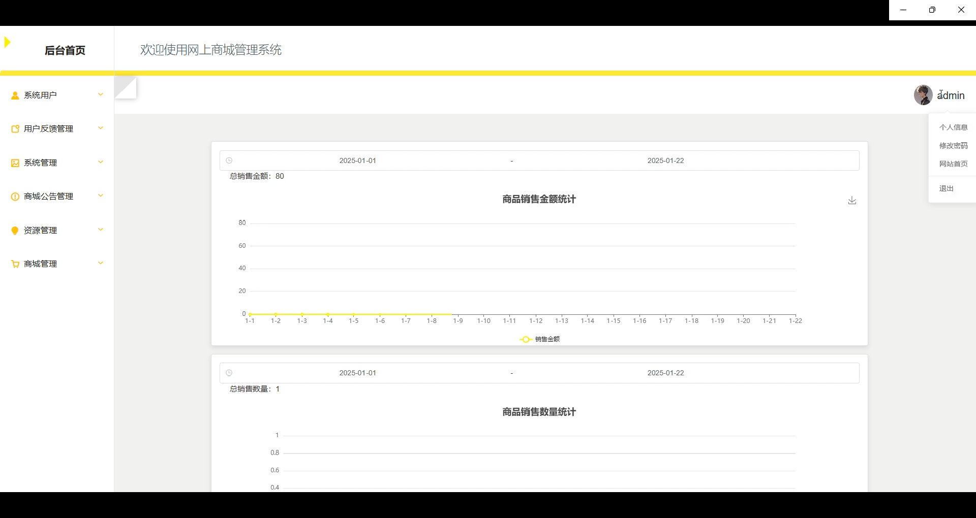 后台首页:管理员可以在后台首页查看商城的整体销售情况,包括商品的销售金额、数量、订单成交量等统计数据,帮助进行运营分析和决策。
