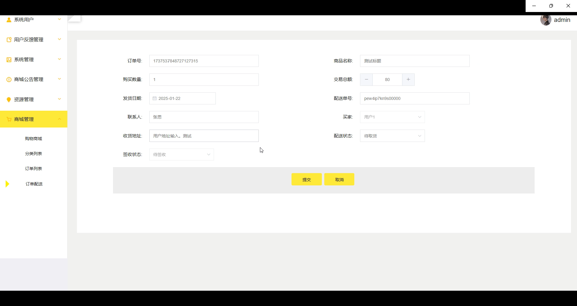 商城管理模块包括商品管理、分类列表、订单列表和订单配送功能。管理员可对商品进行新增、修改、删除,并管理商品分类;订单列表展示所有用户订单,支持查看订单详情、修改状态等;订单配送功能帮助管理员跟踪物流信息,更新配送进度。所有操作都可通过筛选和搜索功能高效完成,确保商城日常运营顺畅,提高管理效率。界面如下图:
