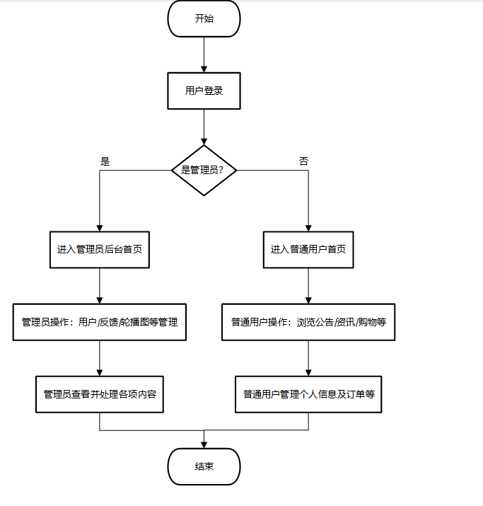 系统操作流程包括用户端和管理员端两个主要环节。用户端,用户首先注册登录,浏览商品并加入购物车,确认订单并完成支付,最后查看订单状态与配送信息。管理员端,管理员通过后台登录,进行商品的新增、修改与删除,管理订单与用户信息,查看数据报表进行销售分析,发布商城公告或促销活动。整个流程简洁高效,用户和管理员都能通过清晰的操作界面完成各自的任务,确保系统流畅运行。操作流程如图如下所示: