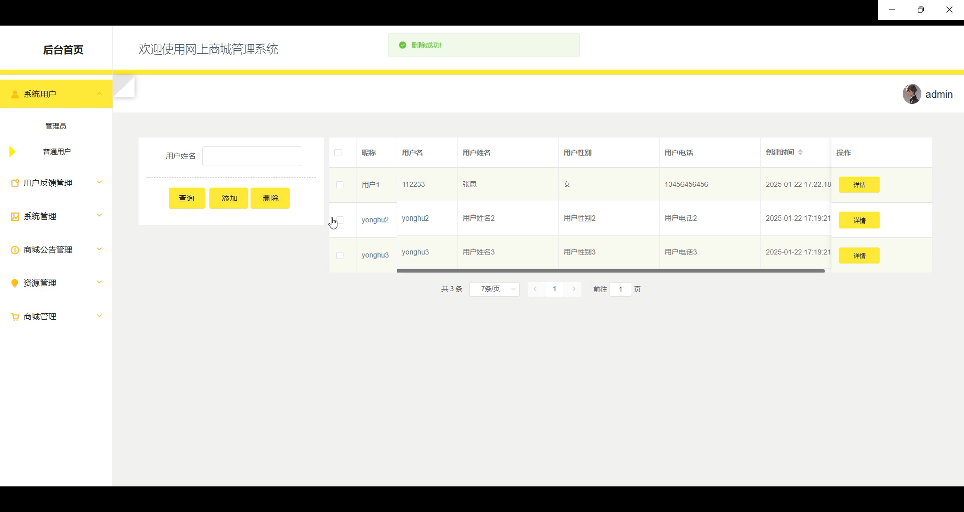 用户管理(管理员、普通用户):管理员可以查看商城所有注册用户的详细信息,管理普通用户和管理员账户,设置不同角色的权限,并可对用户账户进行激活、禁用、删除等操作。