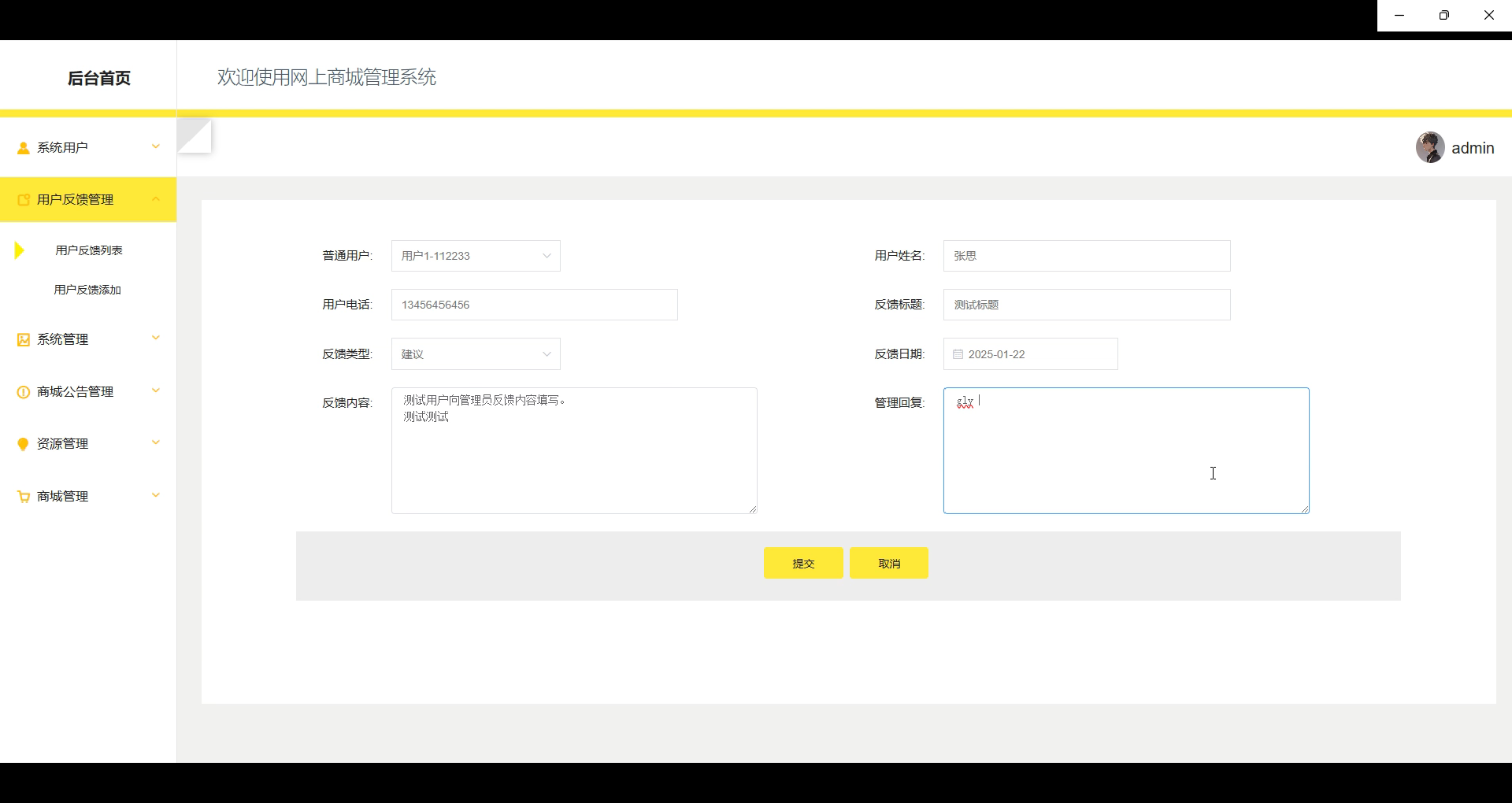 用户反馈管理:管理员负责处理用户在商城提交的反馈信息,及时回复用户问题,改进商城的商品、服务或购物体验,确保用户满意度。