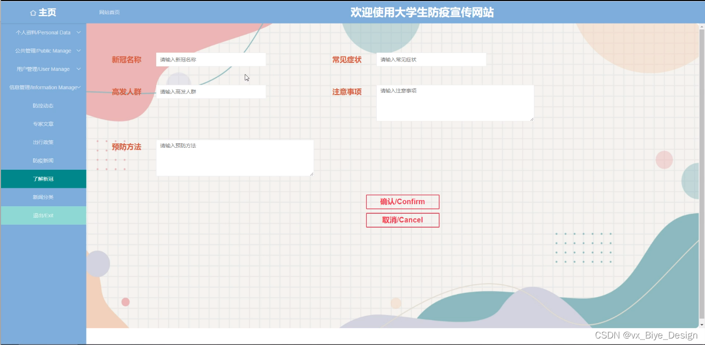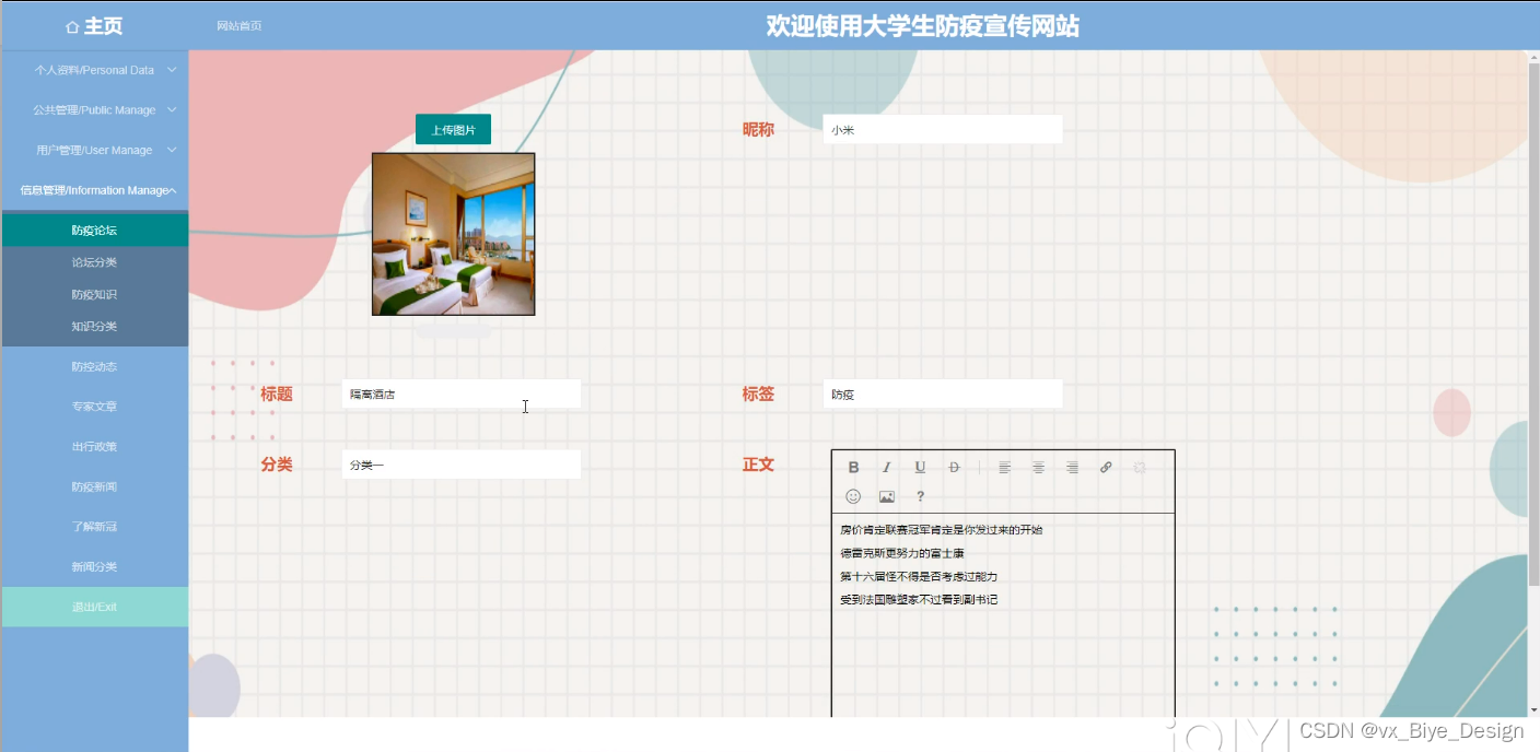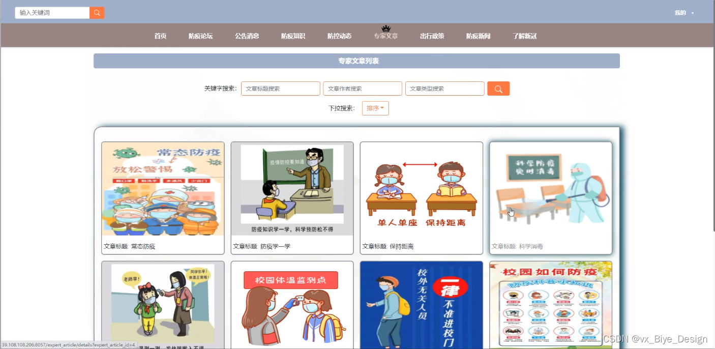 The system uses Java technology, uses browser interaction mode for all business modules, selects MySQL as the system database, and selects My eclipse as the development tool to design the system. The main function modules of the epidemic prevention propaganda website for college students have been basically realized. The system has administrators and users. Administrator: personal data (personal information, password modification), public management (broadcast chart, bulletin board), user management (administrator, ordinary user), information management (epidemic prevention forum, forum classification, epidemic prevention knowledge, knowledge classification), prevention and control trends, expert articles, travel policies, epidemic prevention news, understanding COVID-19, news classification. Users; Home page, epidemic prevention forum, announcement news, epidemic prevention knowledge, prevention and control trends, expert articles, travel policies, epidemic prevention news, understanding of COVID-19, My, etc.