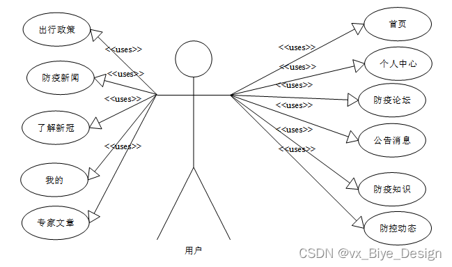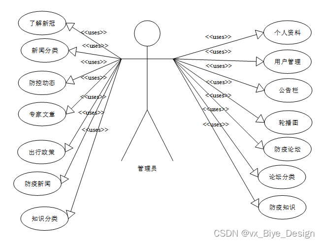 大学生防疫宣传网站 在对需求做解析后,整个系统主要分为二个部分:管理员、用户,每个模块下的分支功能不一样。对功能做出如下说明: