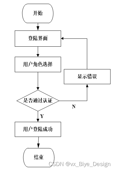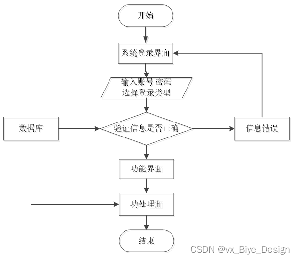 用户想进入系统,首先进入系统登录界面,通过正确的用户名、密码,选择登录类型登录,系统会检查登录信息,信息正确,然后输入相应的功能界面,提示信息错误,登录失败。系统操作流程如图3-4所示。