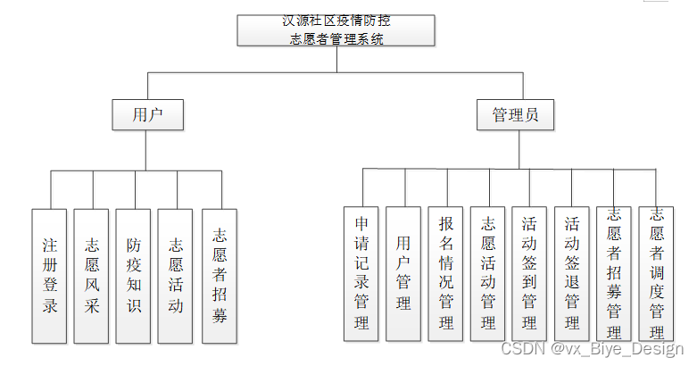 基于汉源社区疫情防控志愿者管理系统的设计基于现有的电脑,可以实现用户管理、志愿者活动、报名情况、活动签到、活动签退、志愿者招募、志愿者调度、申请记录等详细的了解及统计分析。根据系统功能需求建立的模块关系图如下图: