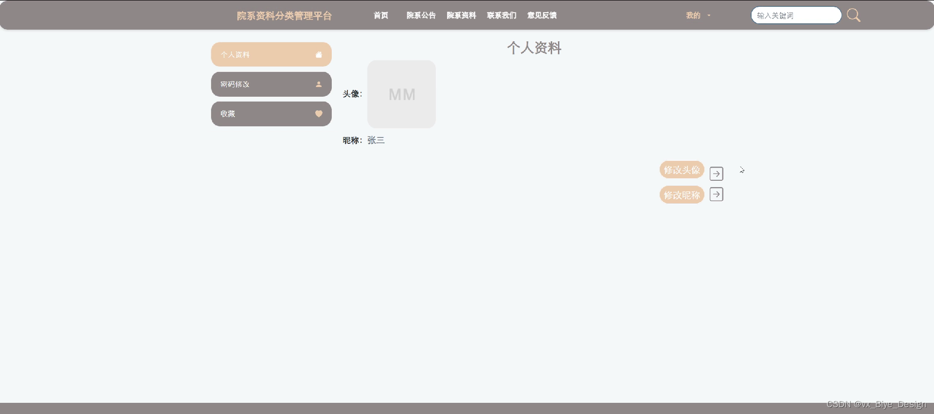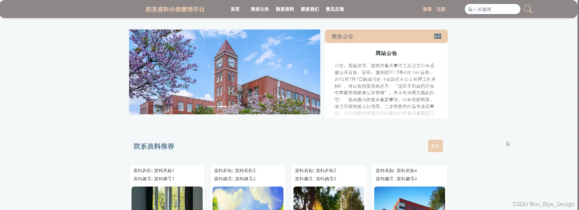 (2)查看院系资料分类管理平台的首页信息:院系资料分类管理平台的首页信息包含了首页、院系公告、院系资料、联系我们、意见反馈等。