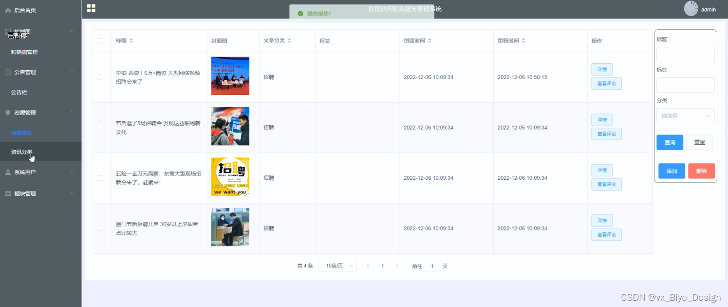 (4)资源管理:当点击“资源管理”这一菜单的时候,会出现招聘资讯+资讯分类这两个子菜单,可以对招聘资讯进行增删改查操作;