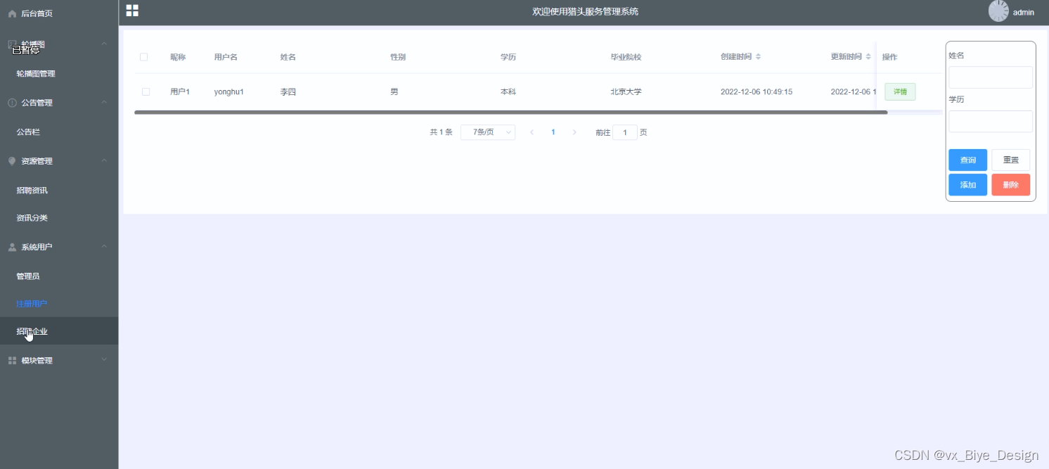 (3)系统用户管理:当点击“系统用户管理”这一菜单的时候,会出现管理员+注册用户+招聘企业人三个子菜单,可以对这三个模块进行增删改查操作;