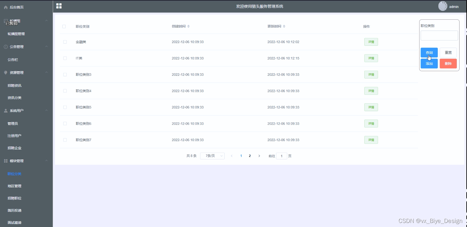 此功能为管理员的功能,管理员点击“职位分类”菜单后,会展示出添加职位分类栏,可以对职位分类信息进行增删改查操作;其界面展示如下图4.12所示。