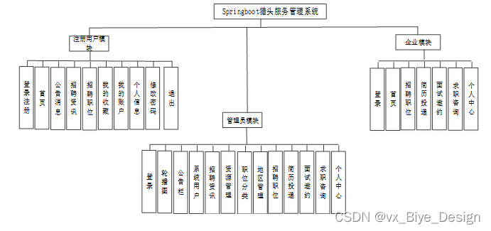 猎头服务管理系统从角色上划分为了注册用户、招聘企业、管理员三种角色。