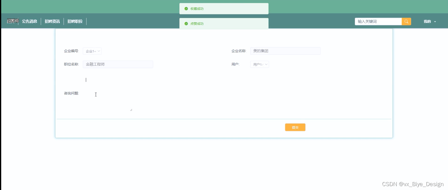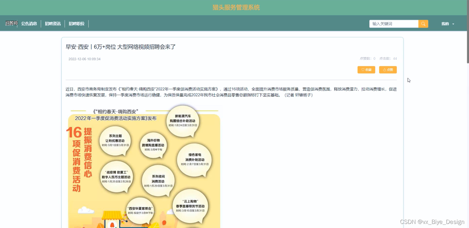 (2)招聘资讯:在首页导航栏上我们会看到“招聘资讯”这一菜单,我们点击进入进去以后,会看到所有资讯列表,在这个界面,我们可以点击进入进行查看、评论、点赞等;