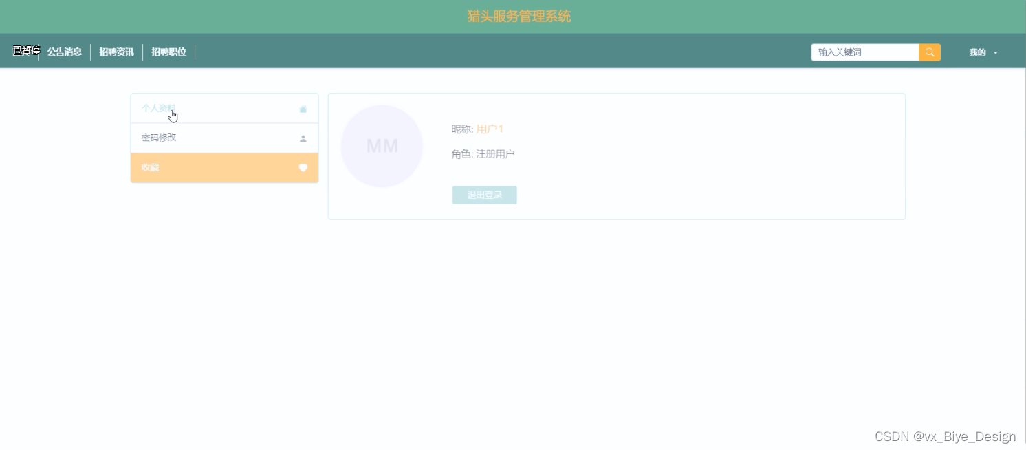 (6)个人中心:当用户点击右上角“我的”这个按钮,就会进入到对应的后台进行信息的管理了;