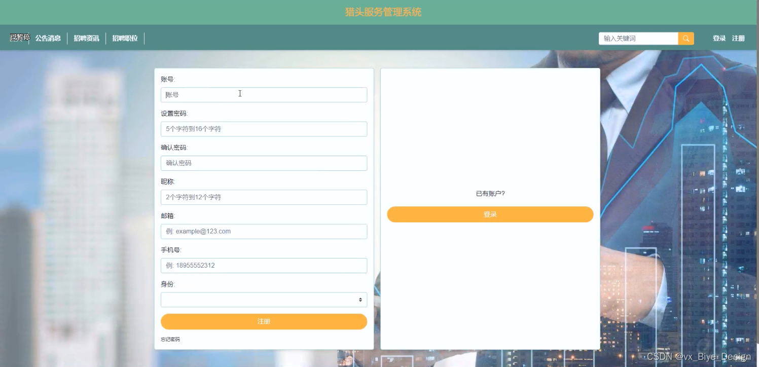 (1)注册登录模块:当用户想要进入本猎头服务管理系统中对资讯进行查看评论以及了解招聘信息等操作的时候,就必须要登录到系统当中,要是新的用户没有猎头服务管理系统的账号的话,点击“注册”按钮,就会进入到新用户注册这个界面上,用户输入对应的账号(必须填写)+密码(必须填写)+确认密码(必须填写,而且要与密码一直)+昵称+邮箱+手机号+选择用户身份等等,然后点击“注册”,系统在用户这一数据库中会查询账号是不是存在,两次密码是不是一样,都填写正确就会注册成功,然后再进行登录,如果是之前已经注册过的用户很长时间没有使用,忘记密码,也可以点击“忘记密码”进行找回;