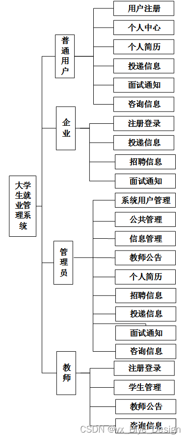 大学生就业管理系统总体分为前台用户模块和后台管理员模块。