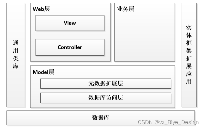 本大学生就业管理系统的架构设计主要分为可以3层,主要有Web层,业务层,Model层。其中web层还包括View层和Controller层,Model层包括元数据扩展层和数据访问层。