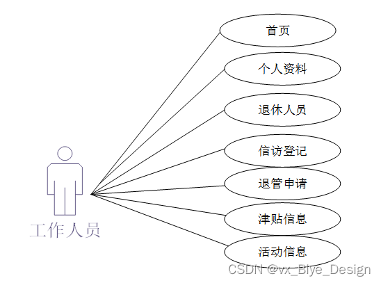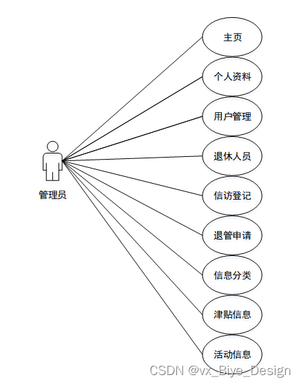 对于管理员可以使用的功能模块主要有主页、个人资料、用户管理(管理员、工作人员)、退休人员、信访登记、退管申请、信息分类、津贴信息、活动信息等功能。