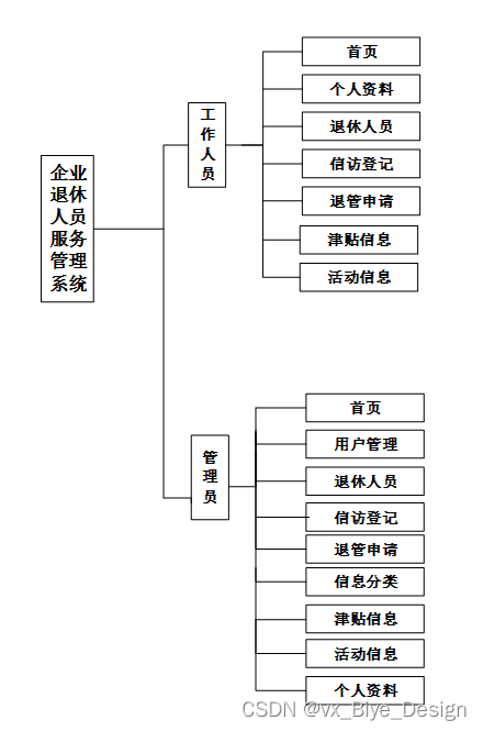 企业退休人员服务管理系统,主要的模块包括主页、个人资料、用户管理(管理员、工作人员、退休人员)信访登记、退管申请、信息分类、津贴信息、活动信息等功能。系统中管理员主要是为了安全有效地存储和管理各类信息,还可以对系统进行管理与更新维护等操作,并且对后台有相应的操作权限。