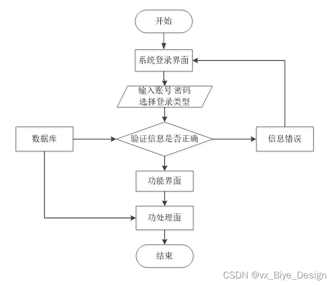 用户想进入系统,首先进入系统登录界面,通过正确的用户名、密码,选择登录类型登录,系统会检查登录信息,信息正确,然后输入相应的功能界面,提示信息错误,登录失败。系统操作流程如图3-4所示。